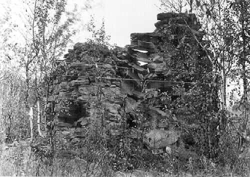 Hyttruinen sedd från ett hörn med hålet i baksidan.