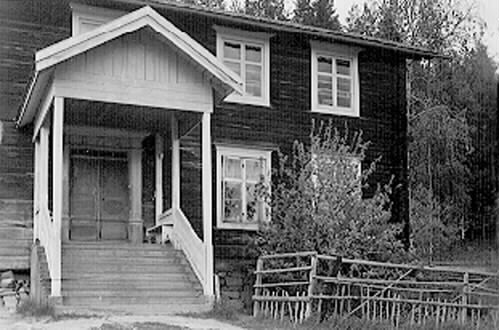 Förstukvisten till Lövgrens gård med det blommande äppelträdet vid sidan. Trädet hade sista hösten burit ett hundratal äpplen. Huset bär datum på takåsens undersida: 18 25/5 44. Övervåningen är påbyggd en gång.