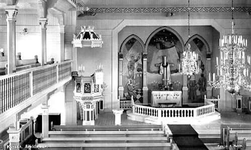 kyrkointeriör; kyrkbänk; ljuskrona; predikstol; läktare; altarring; altartavla