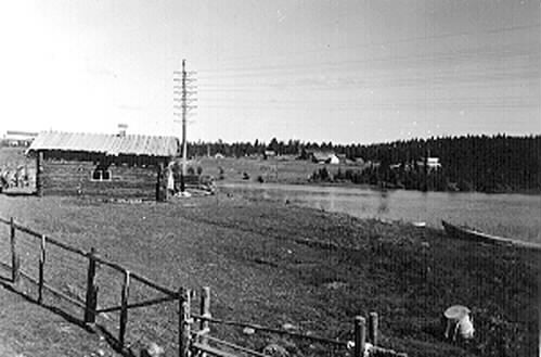 - Utsikt över en del av byn från landsvägen mot nordost. Bortom den lilla sjön ser man Strands gård, som ligger liksom för sig själv. Från telefonstolpen syns sommarladugården, boden (foto. H 183), vinterladugård med flera andra hus samt därbakom själva stugan.
