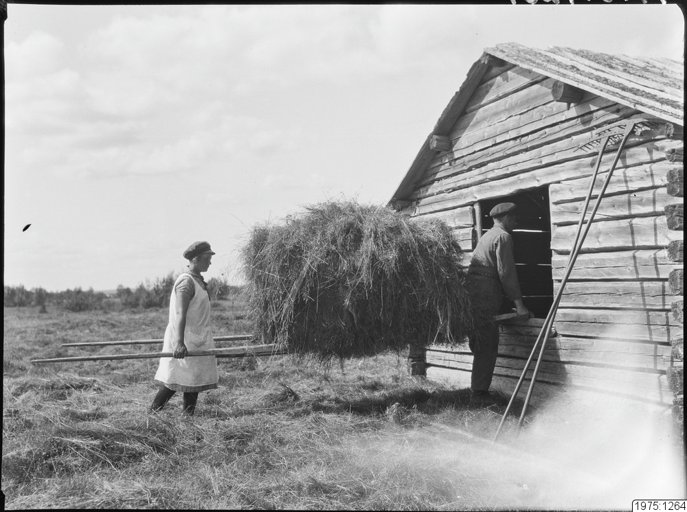 1975:1264 :: höbärgning, lada, redskap, räfsa, höbår