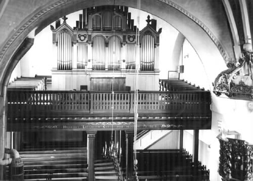interiör; orgelläktare; predikstol; orgel; kyrkbänk