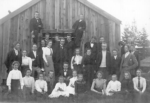 Från vänster: Överst på ladudörrarna en finne Laurin ? och Lasse Baudin. I dörröppningen: Yrjö Sjöstedt (Kasper), Sandin ?, Hilda Carlsson, Tilly F.m, Björklund ? (från Sundsvall), Erkki Kivijärvi. Nästa rad: John Strömberg, okänd Torneåflicka, Fritiof Englund, Aina Reuter, Nykänen, Birger Sbg, Fredrik Carlsson, Einar Reuter. Där ovanför: Finn Haeggman, Einar Paavola, R Sbg, Hugo Östman. Sittande: Siri F-m, Blenda H-m, Anna H-m, Ville Strömberg, Siri Sjöstedt, Sven Bergman, Elli Sjöstedt, Gusti F-m, Signhild F-m, Cissi Carlsson, Edit Strömberg, Jenny H-m.