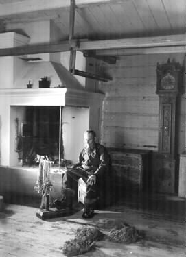Interiör från Pitegården på friluftsmuseet på Gültzauudden i Luleå. N.O. Johansson lagar nät i Pitegårdens kök. Den s.k Pitegården stod ursprungligen i Lillpite och flyttades till Norrbottens museums friluftsmuseum. Det flyttades 1972 till Gammelstad.