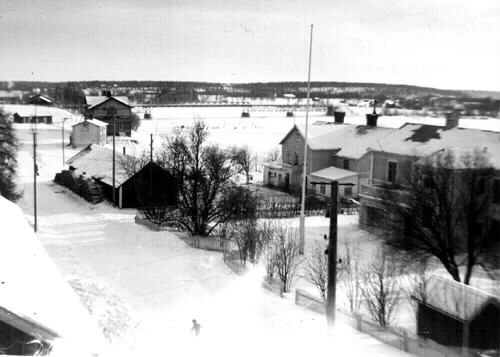 Foto taget från fotografens hustak, Kyrkogatan 16, i riktning mot gamla sjukhuset. I fonden syns den gamla bron.