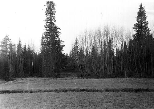 Skogsbrynet vid Boströms gård med gamla hustomtningar bland träden. Vid granen har legat ett hus, vars grund finns kvar.