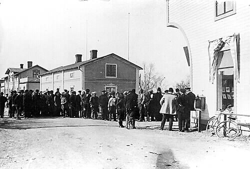 Lotteriförsäljning. Guldsmed Lindbäcks fastighet i bakgrunden, korsningen Centralgatan-Torggatan, 1926.