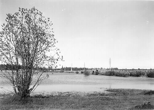 Gamla bron under vårflödet 1939. Från västra stranden.