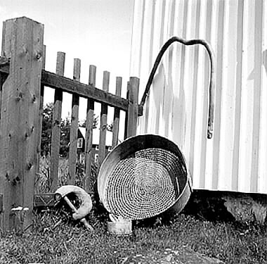 Självvuxen tving, såll, bytta daterad 1853, och rankbåge.