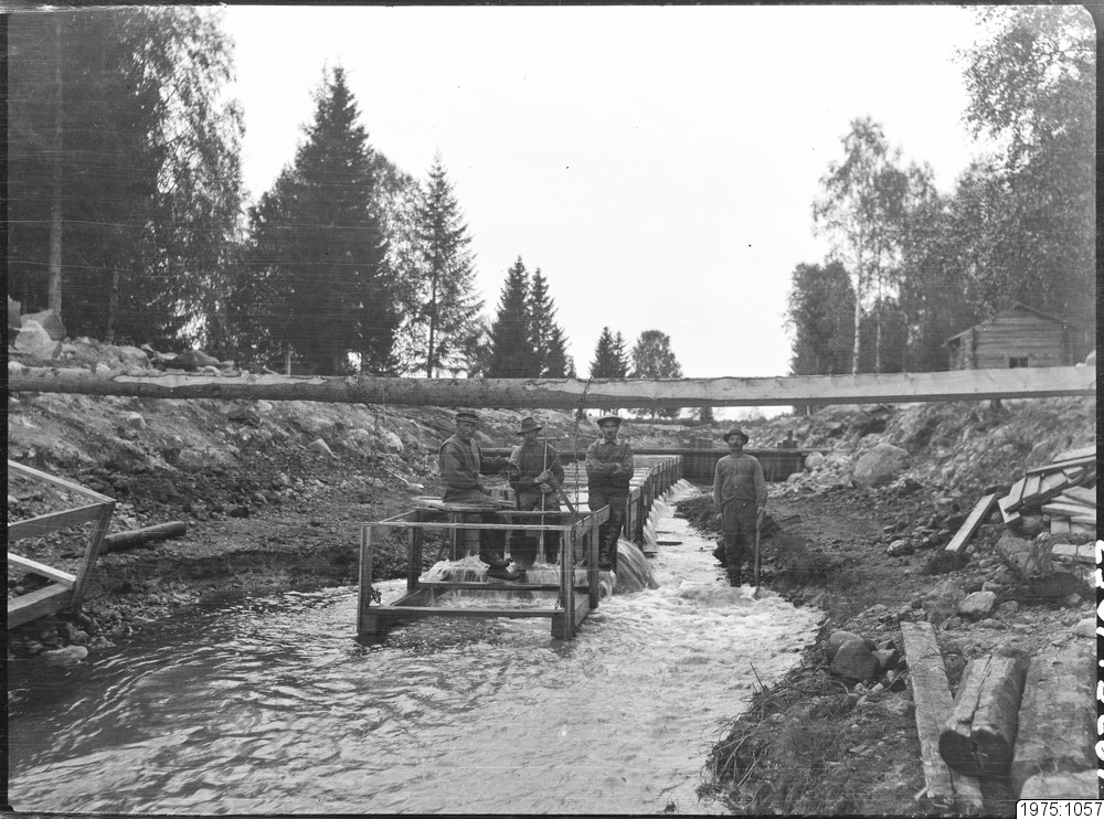 Dikesgrävning med vattnets hjälp. Från vänster: Fridolf Nyström, okänd, Petter Nordström, samtliga från Alvik.