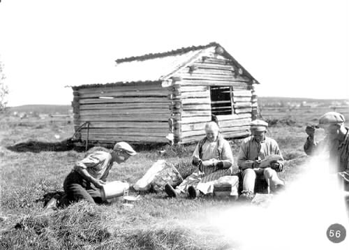 Rast under slåttern på Knaggmyran. Erik Karlsson. "Jon" August mamma, Yngve Lundström, Signar Sandström.