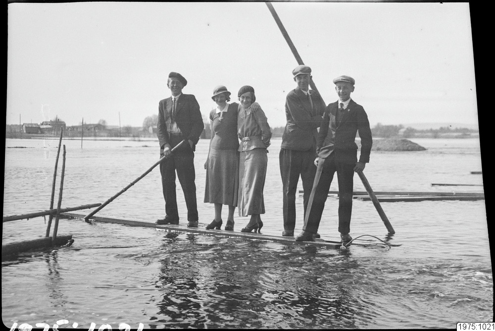 Från vårfloden i Aleån, våren 1936. Översvämning nedanför Rågholmen, Alvik. Edvin, Helga, Hanna och Filip Andersson, Arne Pettersson.