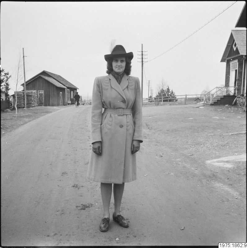 Viola Eriksson, Alvik, utanför Långnäs Samlingshus. Bilden är från 1940-talet.