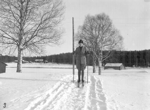 Efraim Isaksson, Långnäs, med "Monters" i bakgrunden mot skogen. Bilden är från 1930-talet.