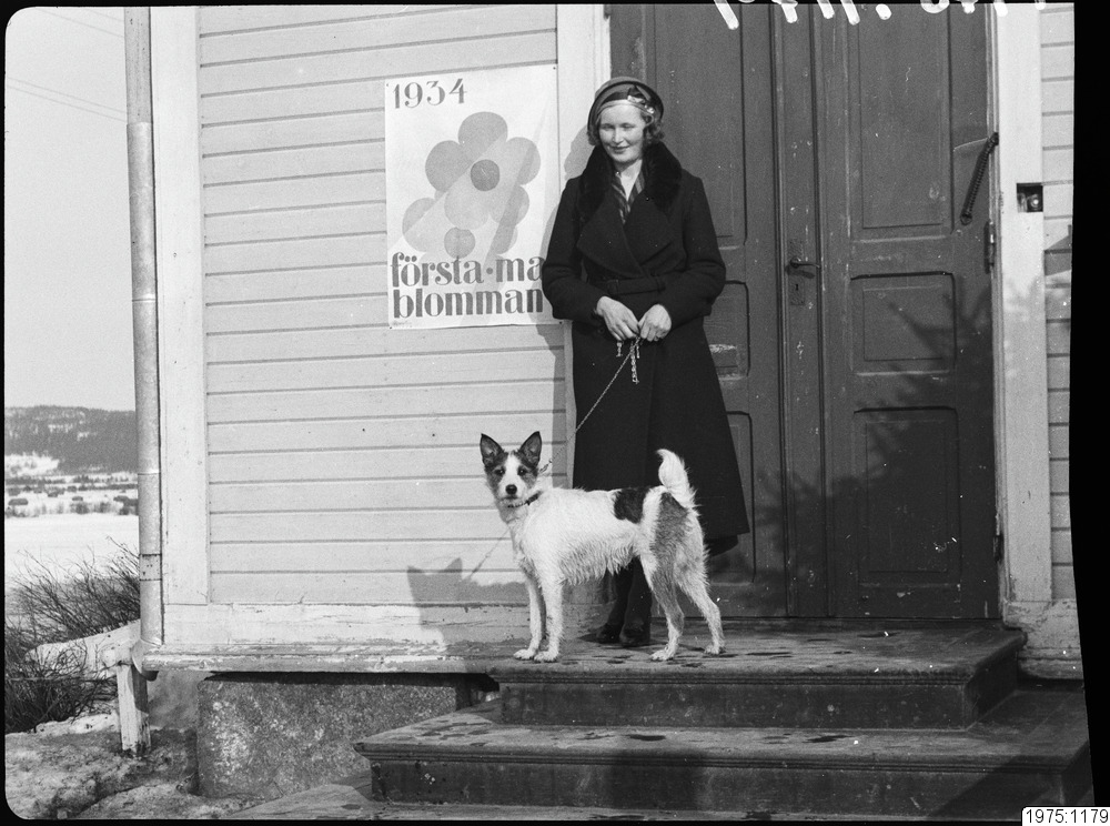Elsa Häggström från Älvsbyn, patient på Hälsan i Antnäs. (Hunden ägs av fotografen Adolf Hjort). Hälsan i Antnäs var först i orten med att sälja Majblomman.