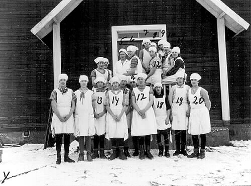 Matlagningskurs i Alvik på 1930-talet. 1. Karin Lundström, 2. Valborg Nordström, 3. Aina Lindvall, 4. Valborg Åström, 5. "Fröken" Hanna Hornberg, 11. Elisabeth Lindström, 15. Helga Månsson, 17. Berta Näsvall, 18. Cecilia Eriksson, 20. Dagny Johansson