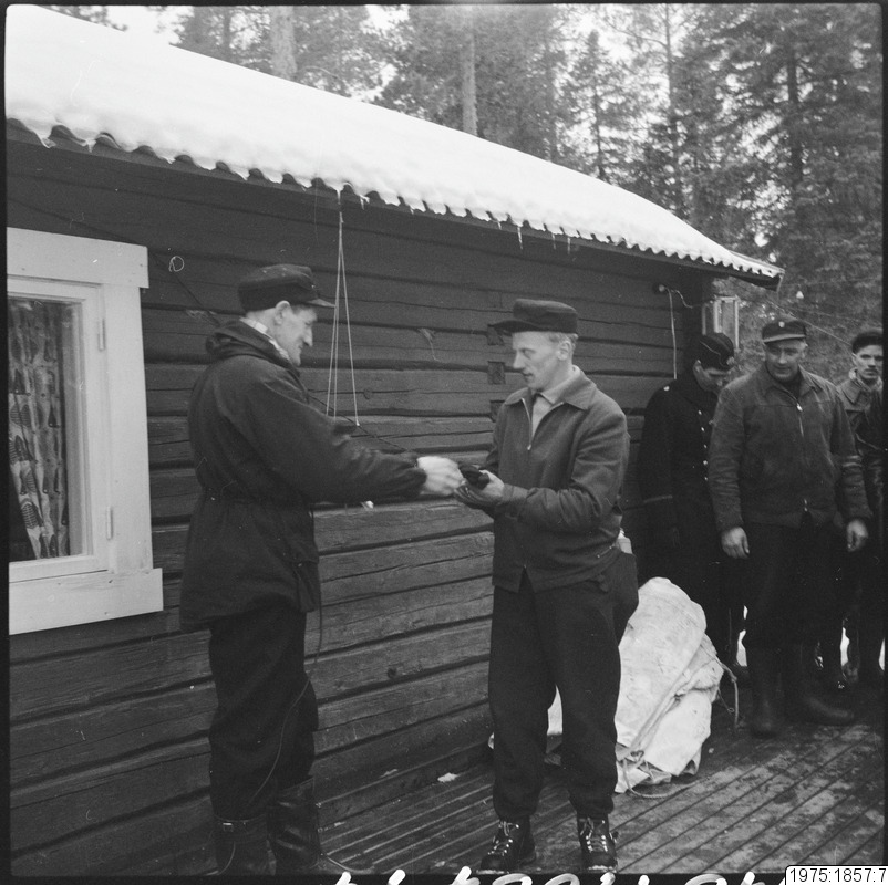 Folke Olsson delar ut priset, en bil - Volvo PV - till vinnaren Helge Burman vid Alviks Idrottsklubbs pimpeltävling i Bjurträsk 28/4 1958.