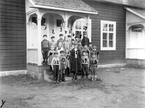 Märtha Lundberg med sin skolklass i Bredsel. Bilden är fotograferad på 1920-talet.
