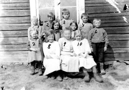 Troligen skolklass där Hjort skolade i Björkberg, Älvsbyn. Bilden är fotograferad mellan åren 1920 och 1923.