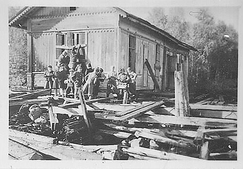 Brädgårdskontoret, där arbetarna hölls inspärrade. Kortet är taget 1952.
