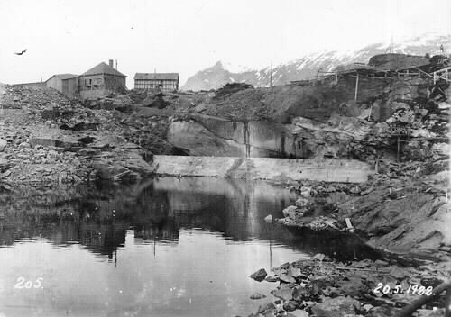 Skibord framför avloppet från regleringstunnel I med stängd lucka.