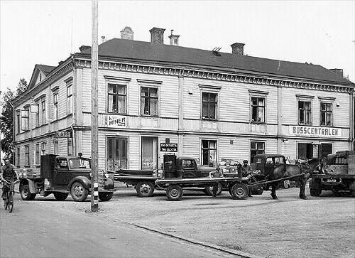 - Luleå stad. Kv. Kycklingen nr 2. Västra hälften. "Bobergs", C.G. Norbergs, Henny Tegström & Co:s, nu i stadens ägo. Busscentralen. Lastbilar. Häst och vagn.