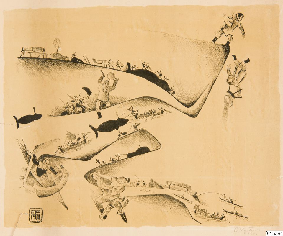 Ett collage av olika händelser som utspelar sig bland män och kvinnor, t ex jakt, båtfärder och olyckor. Det grafiska bladet har gul/svart tryck på bruntonat papper. Bottenfärgen är gul och figurerna svarta.