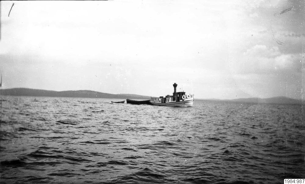 - Ångbåten Karl XV, som trafikerade Storavan och Uddjaur från Avaviken till Skeut och ibland ända till Båtsjaur. Bilden är tagen utanför kajen i Bergnäsudden, Arjeplogs sn 1927. Pråm och livräddningsbåt. I pråmen fraktades till exempel kor och hästar.