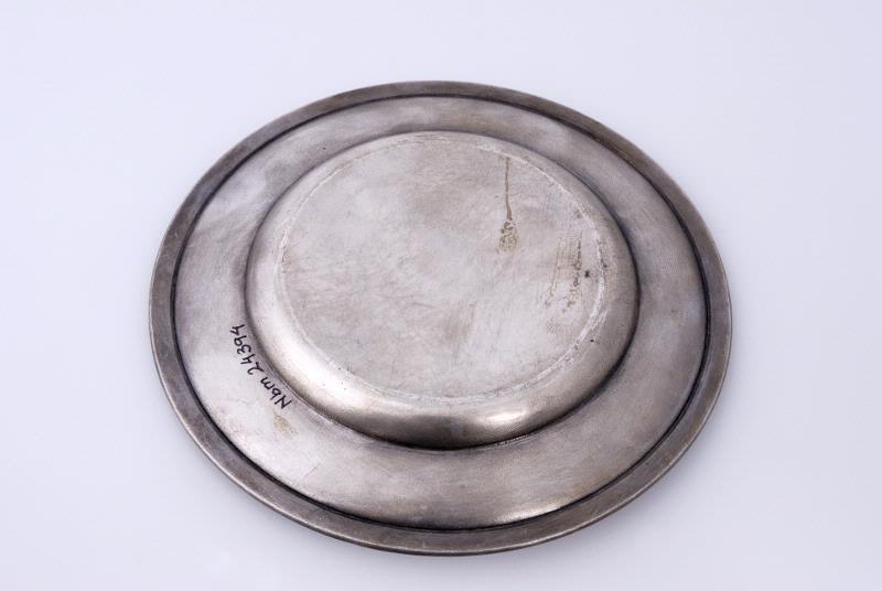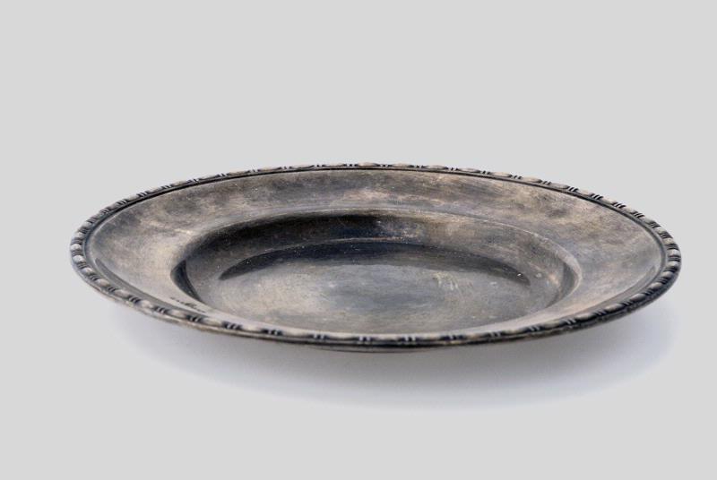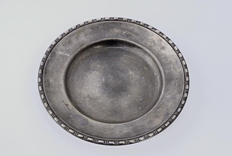 Mindre, runt silverfärgat fat med utvikt brätte och dekorbård. Dekorbården består av åsar åtskiljda av två midre åsar mellan dem som är tvärställda. På brättet är stämplat: "G.A.B.", en Vasakärve och "NS ALP".