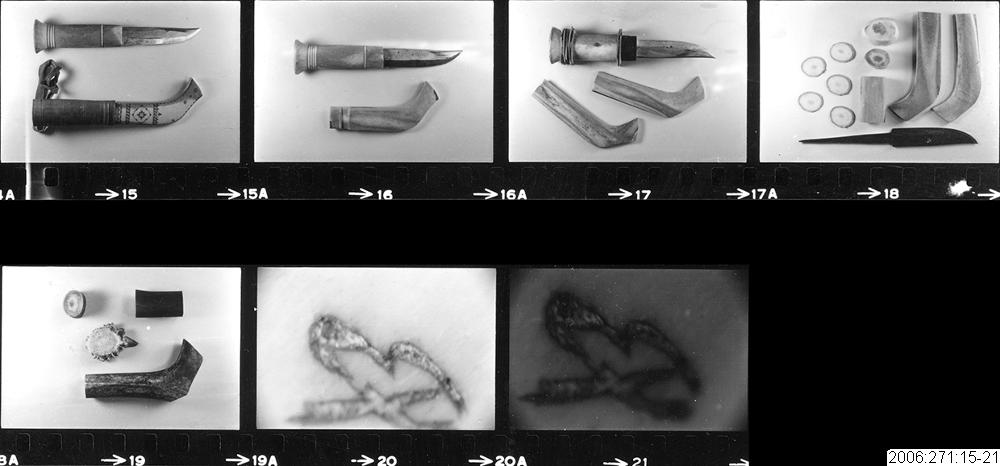 16-17. Inv.nr Nbm 10399 och 10398. Olika delar av tillverkningen av en samisk kniv, där slutprodukten blir en kniv som inv.nr Nbm 10400 (bild 15).