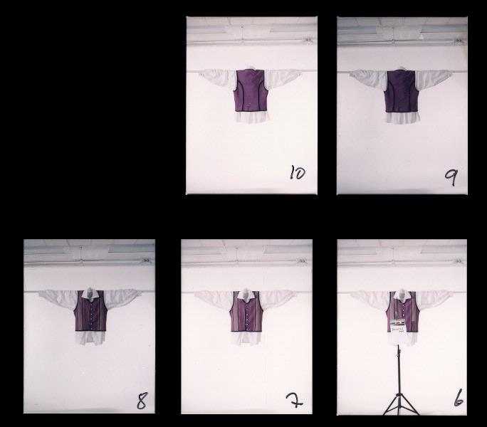 Tillhörande halsrem och rotbrosch, se acc nr 1995:2471:12 och filthatt, svart med lila band - "rallarmössa", se acc nr 1995:2467:13.