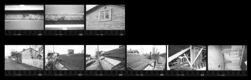 1996:134:28A-36 :: gårdshus, fönster, takläggning, interiör, vind, takkonstruktion, vägg, renovering