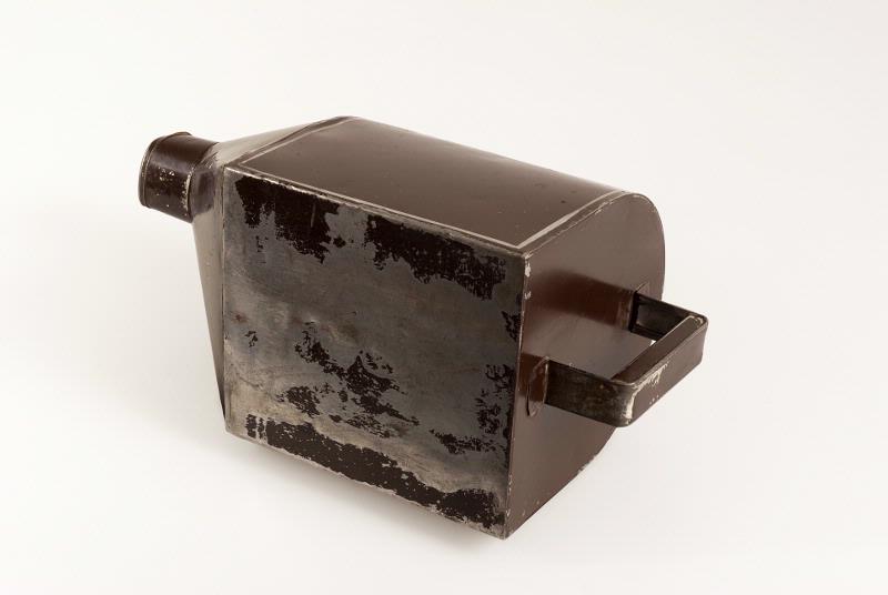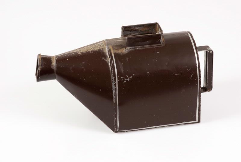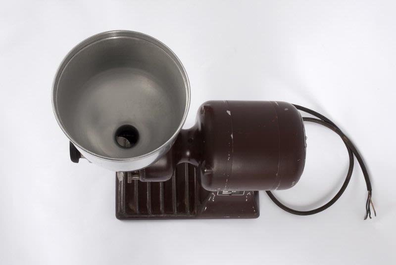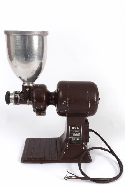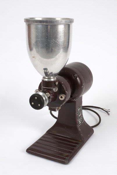 Mörkbrun elektrisk kaffekvarn bestående av en bottenplatta med ett fält med åsar och en sockel. På sockeln vilar en cylinderformad motordel (Diam 16 cm, L 18 cm) som är anslutet til ett malverk med en doseringstratt (H 24 cm, öpnning Diam 18,5 cm) i vitmetall. På det räfflade fältet står en handtagsförsedd kaffepulveruppsamlare med pip, av plåt. Kvarnen är försedd med en isolerad svart 3-fas elkabel (L 130 cm) och fyra fötter.