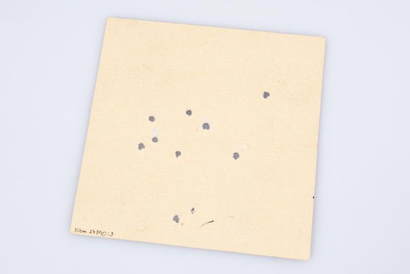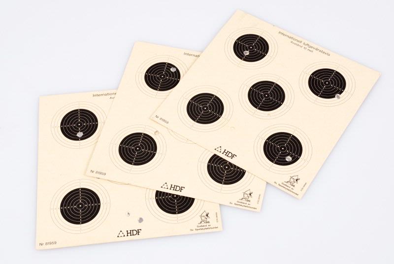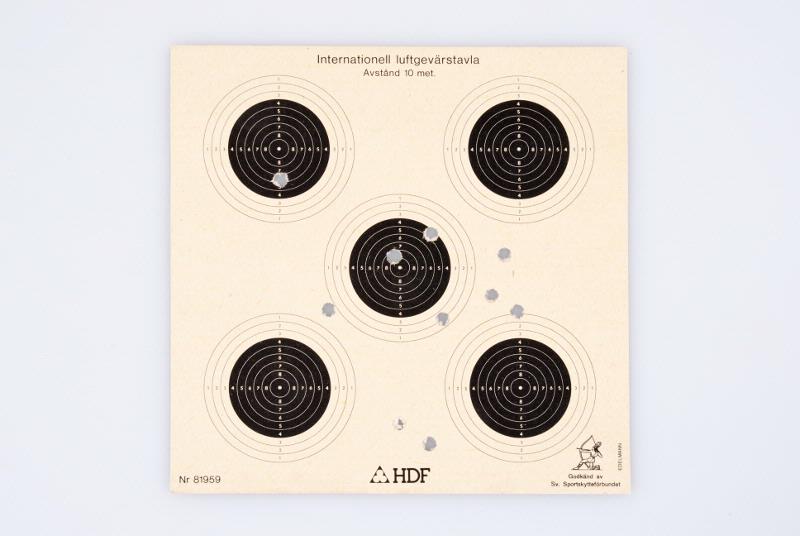 Måltavla av papp för luftgevärsskytte. På den fyrkantiga pappskivan finns återgivet fem runda måltavlor (Diam 4,5 cm) graderade från 1-10 där den 4- 9 ringarna är ifyllda.