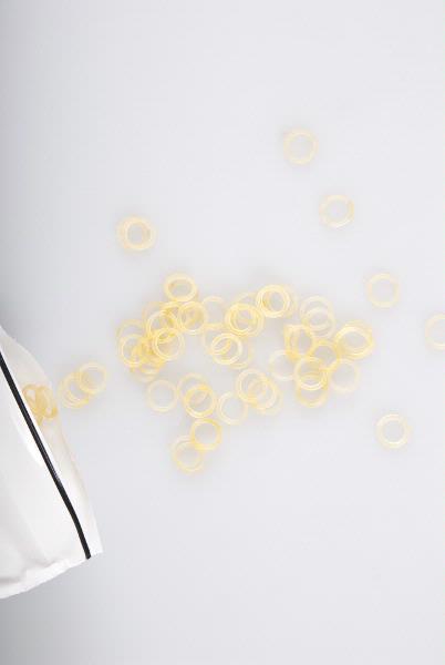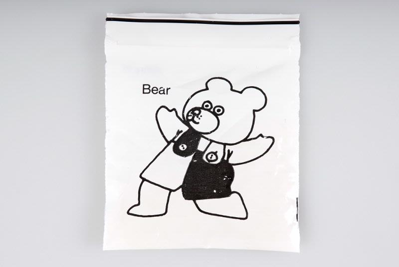 Tandställning bestående av ett antal gummiringar i en vit platt zip-påse med tryckförslutning. På ena sidan påsen finns en nallebjörn med kortbyxor med hängslen samt texen: "Bear", med svart tryck. På andra sidan står det: "Ormco SYBRON ORMCO Z-pak elastics BRAND". Två tandrader med texten: "RIGHT" och "LEFT". Och längst ner står det: "3E (1/4") 4-½ Oz. Glendora, California 91740". med svart tryck.