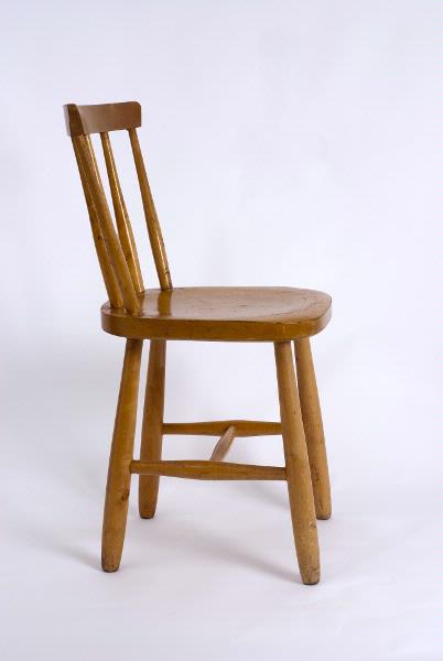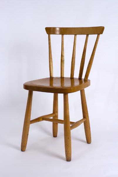 En pinnstol i trä. Stolsryggen har fem pinnar. Mellan två av benen går två slåar och mellan slåarna går ytterligare en slå.