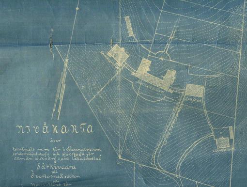 Nivåkarta/situationsplan över tomtplats för bygdesanatorium, epidemisjukstuga och sjukstuga för allmän sjukvård samt läkarbostad, 1921. Matarengi 1:10, Övertorneå, Övertorneå sn och kommun.