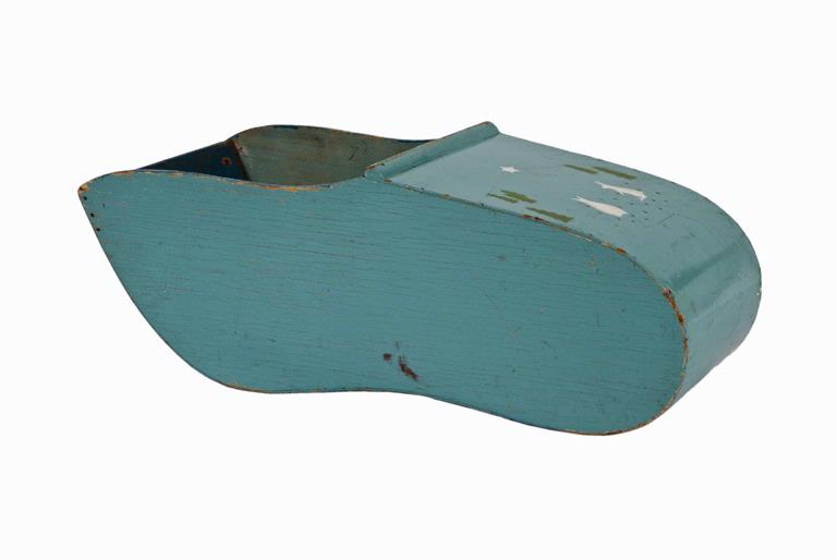 Sparklåda för docka, blåmålad med motiv föreställande 6 st gröna granar, 2 st vita harar och en vit stjärna. Bakstycke samt underrede är blåmålade, sidoväggar och överstycke är grönmålade. Rundad front. Plywoodväggar. Botten samt överstycke/front av masonite. En trälist finns uppe på lådans överstycke intill öppningen. I bakstyckets yttersidor finns två små genomborrade hål. Sparklådan är sammanfogad med små järnspikar.