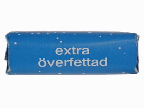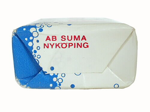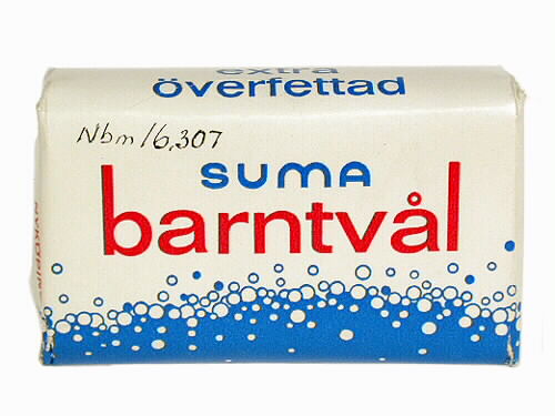 Tvål i förpackning av papper med två-färgstryck (rött och blått). På förpackningen är bubblor och text "EXTRA / ÖVERFETTAD / SUMA / BARNTVÅL / AB SUMA / NYKÖPING". Innanför ytter-höljet finns en bit styvare papper, virad kring tvålen.