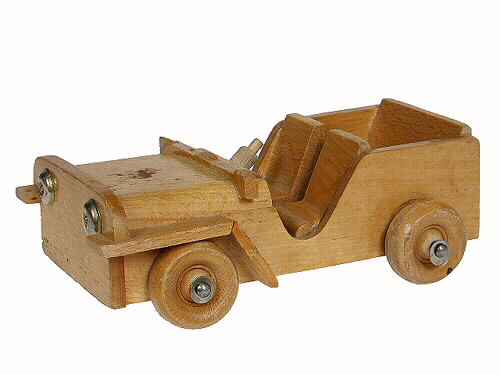 - Leksaksbil, jeep, av omålat trä och med små järnlock och nitar som navkapslar och billyktor. Jeepen saknar tak och har två sittstolar fram och ett helt baksäte. Styrpinne som ratt. Reservdäck saknas liksom vindruta och dragkrok. Under jeepen står det skrivet med blyerts "L .G. B."
