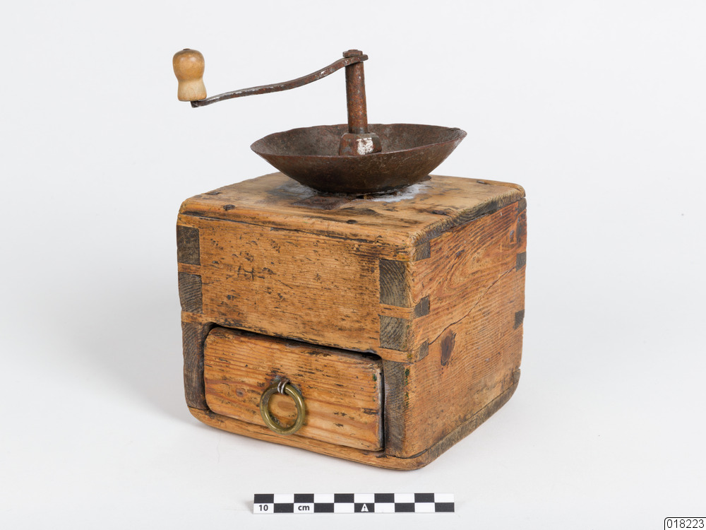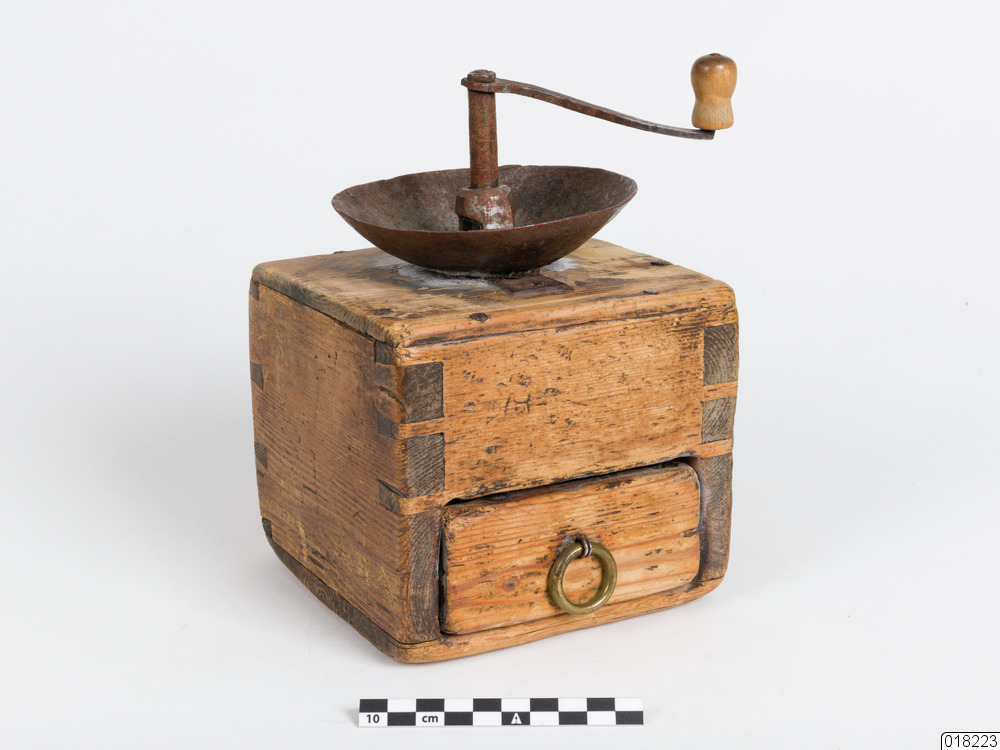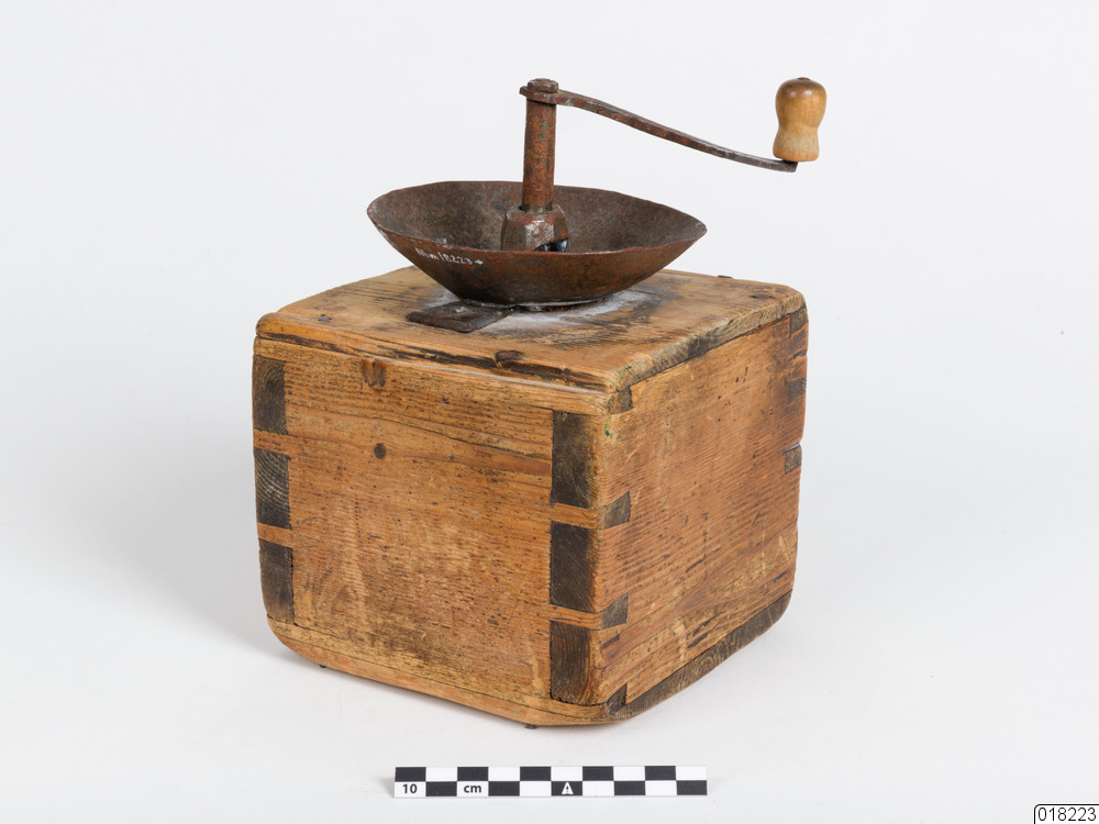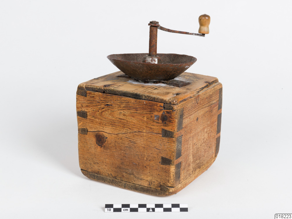 Kaffekvarnen består av en kvadratisk träkub med en utdragbar låda nertill på framsidan och en kvarn med vevarm ovanpå kuben. Kubens sidor är sinkade, men ovandel och botten är sammanfogade med spik. Den utdragbara lådan som är till för att samla upp det snusmalda kaffet, vars framstycke både är sinkat och spikat, har en mässingsring som knopp. Bakstycket på lådan är förstärkt med ett järnbeslag. Veven ovanpå kuben avslutas med en träknopp längst ut på den svängda armen och har även en skålad form för bönorna runtom det lodräta staget som håller själva kvarnen.