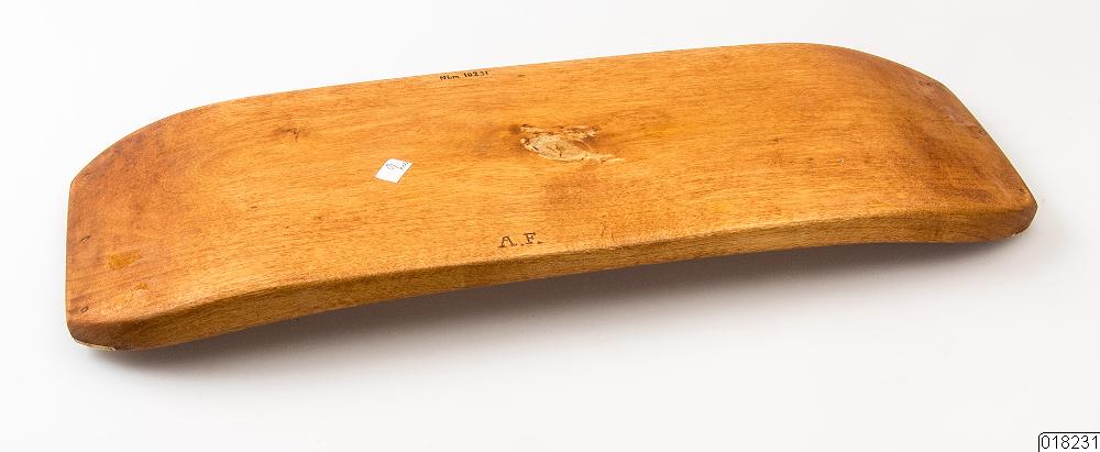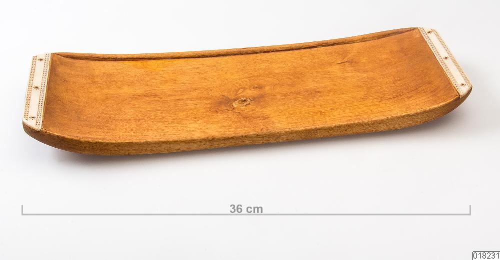 Brickan är mycket enkelt utformad i betsad furu. Den är ljust brun. Formen är rektangulär med svagt uppåtböjda kortsidor och en liten kant på långsidorna. Kortsidorna är svagt fasade och har beninläggningar fästade med vardera tre nitar som är dekorerade med stjärnor runtom. Både över och under nitarna löper en bård. Mitt på brickan finns en stor kvist som är behandlad med något som förhindrar kåda att tränga ut. Mått: L 35,7 cm B 12,6 cm Höjden varierar mellan 1,2 -1,6 cm beroende var på brickan man mäter.