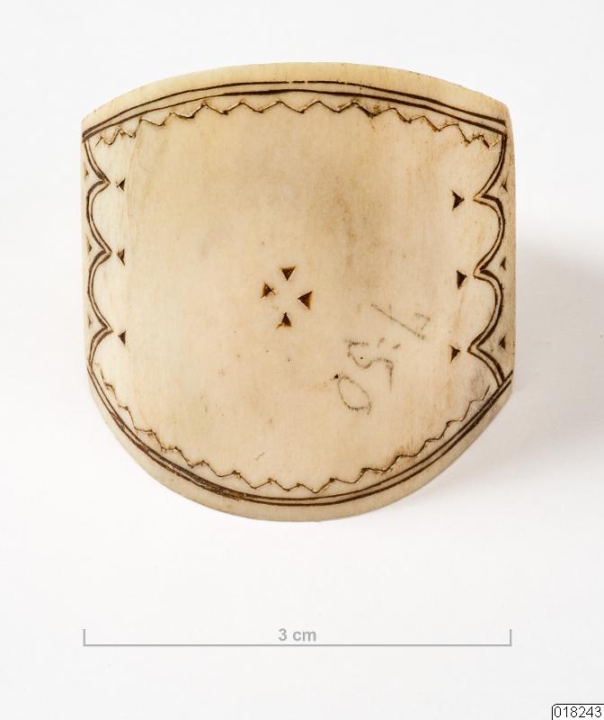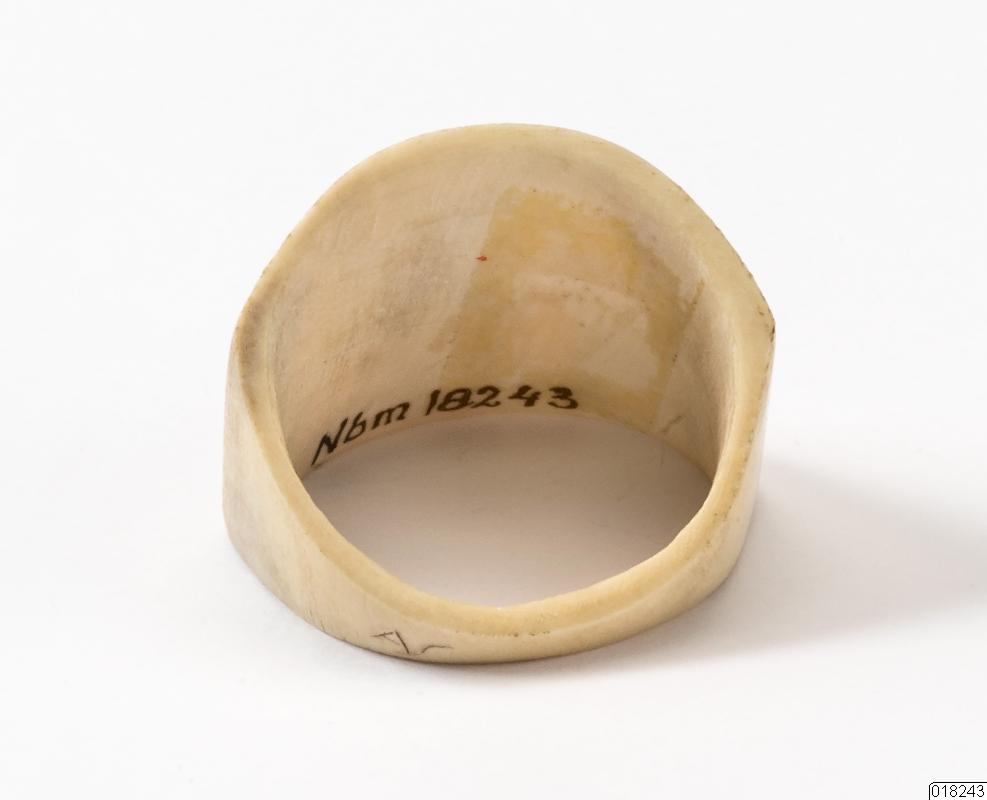 - Sölja i ben av ren. Framsidan som bäraren visar utåt är välvd till formen och mycket bredare än på baksidan där ringen endast mäter några millimeter på smalaste stället. Endast framsidan är dekorerad i brunt. Det är en bård av dubbla linjer som på sidorna bildar uddar med små trekanter både på in- och utsidan om bården. Ett zick-zackmönster pryder även insidan av linjerna upptill och nertill på ringen. Dekorationen i mitten av ringen utgörs endast av fyra mot varandra ställda små trekanter. På framsidan står priset skrivet med blyerts "7:50". På baksidan finns tillverkarens signatur inristad. Den ser ut som "AS".