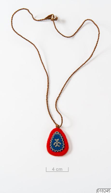 Hängsmycket är tillverkat av tennbroderi på yllekläde med tillhörande snodd av barkgarvat läder. En äggformad bottenplatta i klarrött yllekläde med en mindre platta i samma form av blått kläde ovanpå. Runt kanterna på den blå plattan löper ett zick-zackmönster av tenntråd. I mitten en sjuskaftad figur i samma material. Arbetet är mycket elegant utfört, man kan inte se tråden som håller tenntråden på plats. Den röda bottenplattan är fodrad med en bit barkgarvat renskinn. Till denna hör en ögla fästad i toppen på smyckets baksida i samma material varigenom lädersnodden löper. Fodringen är fastsydd för hand med röd tråd. Snodden hålls ihop av ett fint, litet spänne i renhorn. På snodden sitter sameslöjdsmärket fastklistrat med en tapebit. Utanpå sitter en klisterlapp med siffran "18" och priset "25:-" på andra sidan.