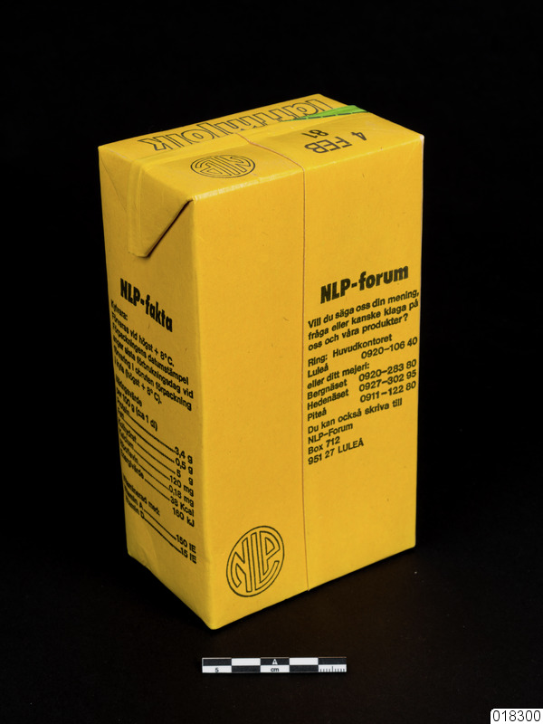 På baksidan kan man läsa om "NLP-forum/Vill du säga oss din mening,/fråga eller klaga på/oss och våra produkter?/Ring Huvudkontoret/Luleå 0920/106 40/eller ditt mejeri:/Bergnäset 0920/283 80/Hedenäset 0927/302 95/Piteå 0911/122 80/Du kan också skriva till/NLP-forum/Box 712/951 27 LULEÅ". Längst ned till vänster företagets logotyp.