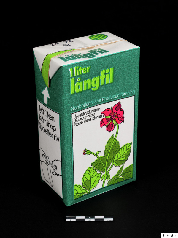 På framsidan står det "1liter/långfil" i ljusgrönt och "Norrbottens läns Producentförening" med vit text på mörkgrön botten. Under detta en tecknad Åkerbärsblomma med blad och en outslagen knopp i en svart ram. Blomman är tecknad på vit botten. Blomman och knoppen i ljus och litet mörkare cerise samt bladen i ljus- och mörkgrönt. I ramen till vänster står det med svart text: "Åkerbärsblomman/Rubus arcticus (kursivt)/Norrbottens blomma".