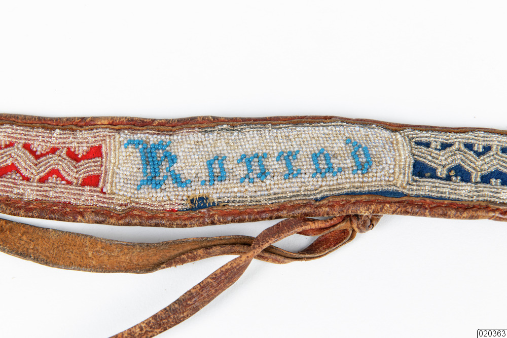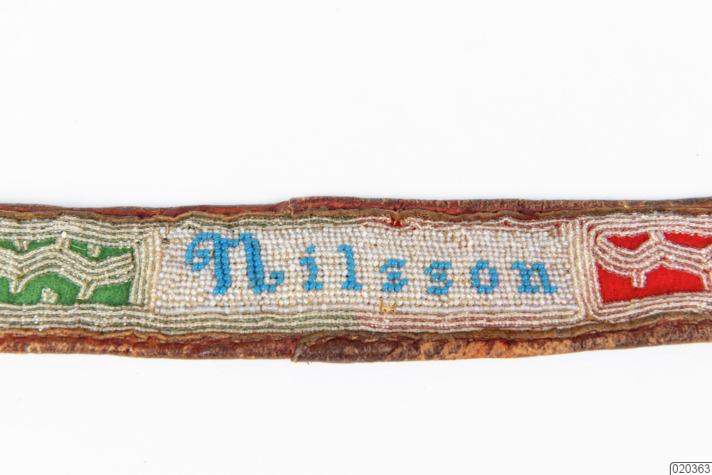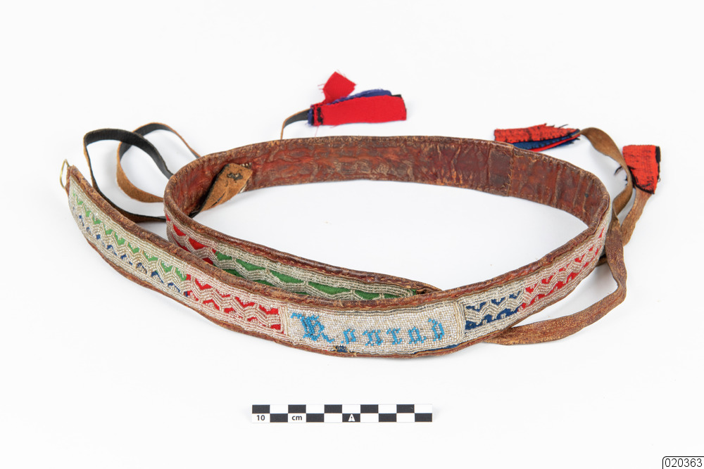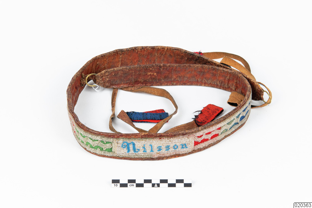 - Bälte, samisk, för herre av renskinn med vitt pärlbroderi på blå, röd och grön vadmalstyg, samt blå pärlbrodyr text "Konrad Nilsson". Vid bältets avslut finns en fastsydd metallögla och 28 cm in från öglorna på bältets baksida, finns på varsin sida två läderbandspar (längd 37 cm) med fastsydda tygbitar i färgerna röd, blå och svart. Det ena läderbandsparet är av renskinn och det andra paret har en svart ovansida.