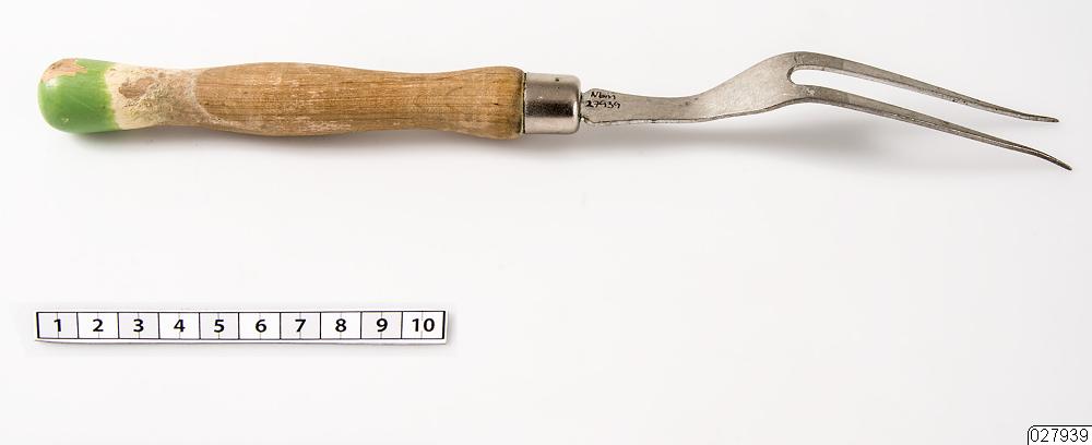 Stekgaffel med svarvat handtag i trä. Liknande handtag som Nbm 27938.