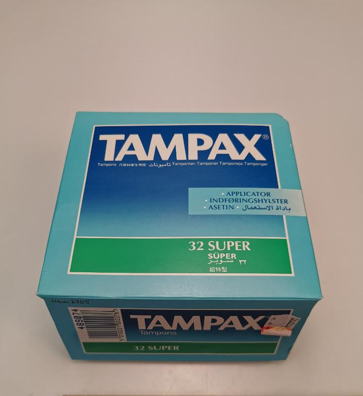 Fyrkantig ljusblå tamponglåda av papp. På alla sidor utom baksidan står det: "TAMPAX Tampons" med vit text på blåskiftande botten och " 32 SUPER" med vit text på ett grönt fält, inramat med vita kanter