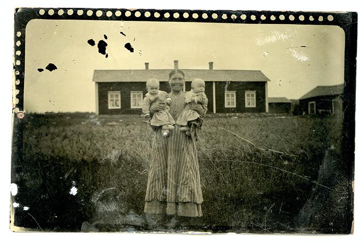 Kristina Lovisa Hansson med tvillingflickorna Karin och Rut avporträtterade framför Leonard och Edvin Hanssons fastighet "Inahed" i Sörbyn. Kristina Lovisa är farmor till flickorna och gift med Pettter Hansson. Tvillingflickan Karin Maria är gift med Ivar Engman, Sörbyn.